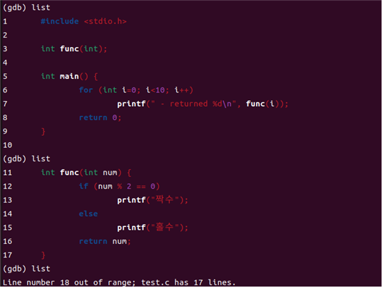 | $ list [num1] [num2] | 줄 num1~num2 사이의 소스코드 출력 (Default: 현재 위치에서 10줄) |