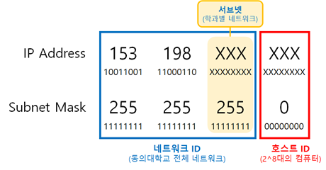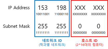 예를 들어, 동의대 컴퓨터공학과의 네트워크 ID가 앞 16 bits인 153.198이라고 가정해 보겠습니다. 호스트 ID는 나머지 16 bits이므로 컴퓨터공학과는 총 (2^16)-2만큼인 65534개의 IP 주소를 사용할 수 있습니다. 그런데 만약 IP 주소를 200개만 사용한다면? 나머지 65334개의 수많은 주소가 사용되지 않고 낭비되는 것입니다.