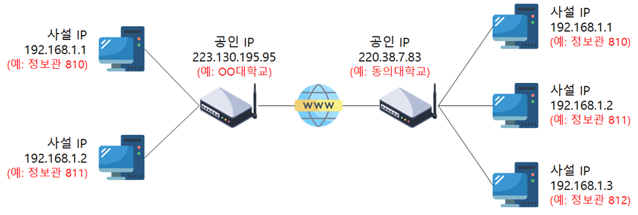 동의대학교를 가리키는 주소가 유일하듯이, 공인 IP는 전 세계에서 유일한 IP 주소입니다. 반면, 사설 IP는 네트워크 내부에서만 유일한 주소입니다. 예를 들어, ‘정보관 811호’가 동의대학교 내부에서는 유일하지만, 외부의 다른 대학교에서도 ‘정보관 811호’가 존재할 가능성이 충분하다는 것으로 비유할 수 있습니다.