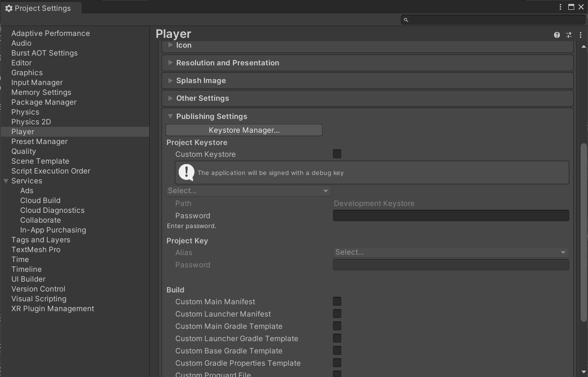 Publishing Settings 항목의 [Keystore Manager...] 버튼을 누른다.