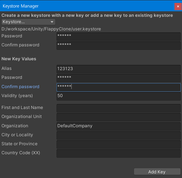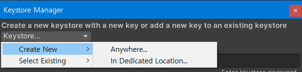 [Keystore...]를 누르고 Create New를 누른 후, 'Anywhere...' 또는 'In Dedicated Location...'를 눌러 원하는 경로에 keystore 파일을 저장한다.