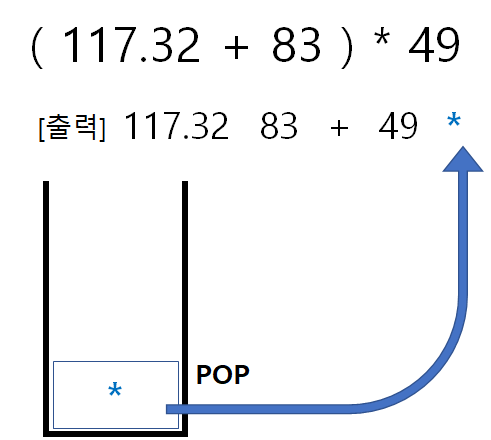 - 수식의 끝에 도달하면, 스택이 EMPTY 될 때 까지 계속 POP한다. 연산자를 POP할 때는 동시에 출력한다.
