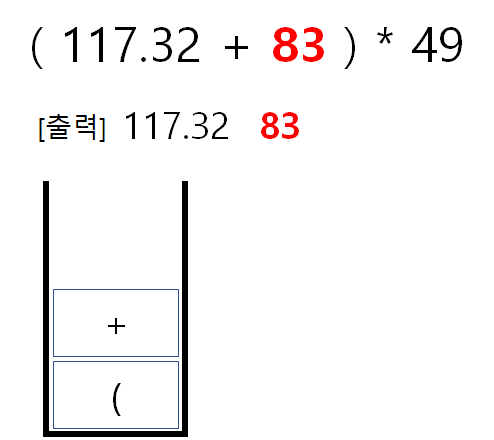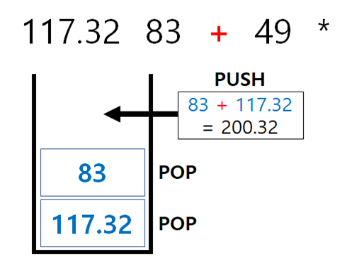연산자 '+'를 만남 → 스택 POP을 두 번 수행함 → POP한 두 피연산자로 연산 수행(83 + 117.32) → 연산 결과(200.32)를 스택에 PUSH |
