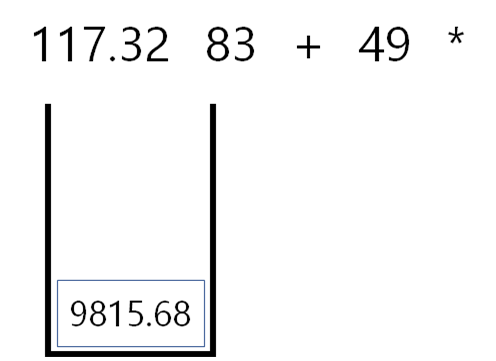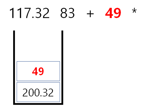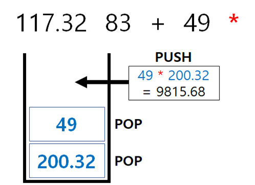 연산자 '*'를 만남 → 스택 POP을 두 번 수행함 → POP한 두 피연산자로 연산 수행(49 * 200.32) → 연산 결과(9815.68)를 스택에 PUSH |