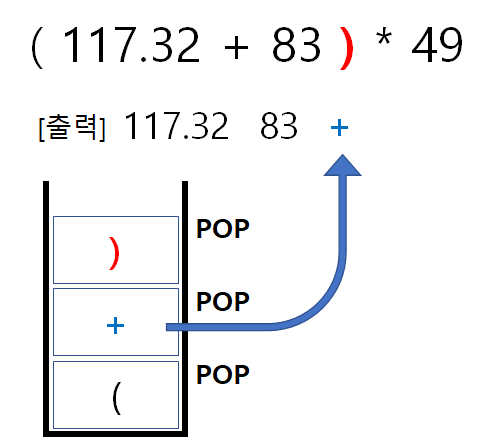 닫는 괄호를 만남 → 닫는 괄호부터 여는 괄호까지 순서대로 스택에서 POP → 연산자는 POP 하면서 동시에 출력 |