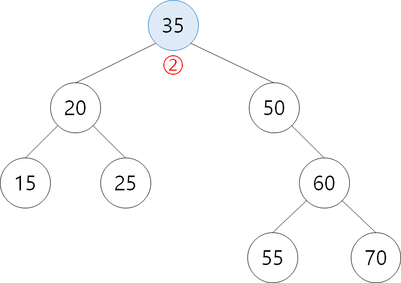② 삭제된 노드 30의 오른쪽 서브 트리 내에서 최소값인 35를 기존 30의 자리로 이동 |