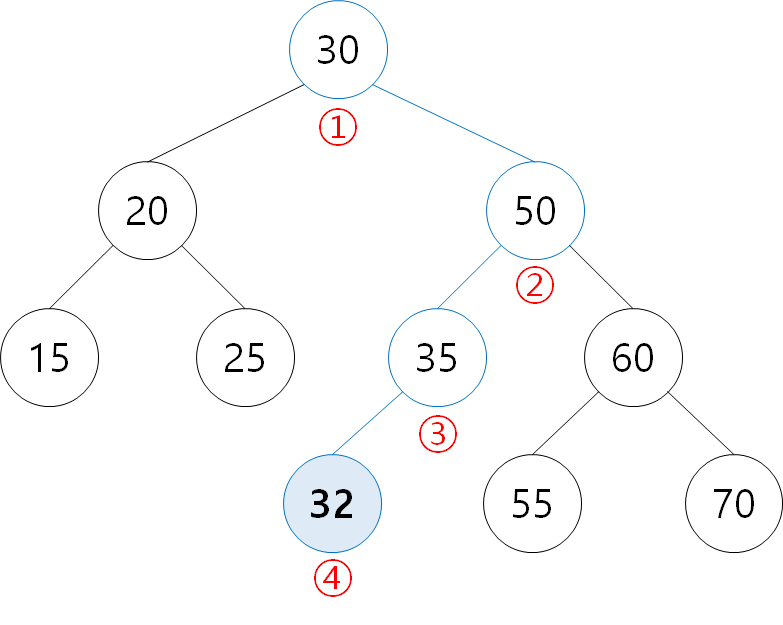 ① 32: 30보다 크므로 오른쪽 탐색 ② 32: 50보다 작으로 왼쪽 탐색 ③ 32: 35보다 작으므로 왼쪽 탐색 ④ 하위 노드가 없으므로 32 삽입 |