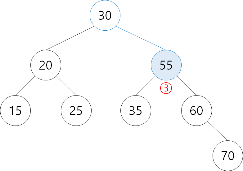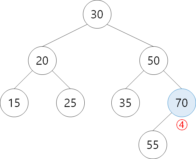 ⑦ 55: 30보다 크므로 오른쪽 탐색. 50보다 크므로 오른쪽 탐색.