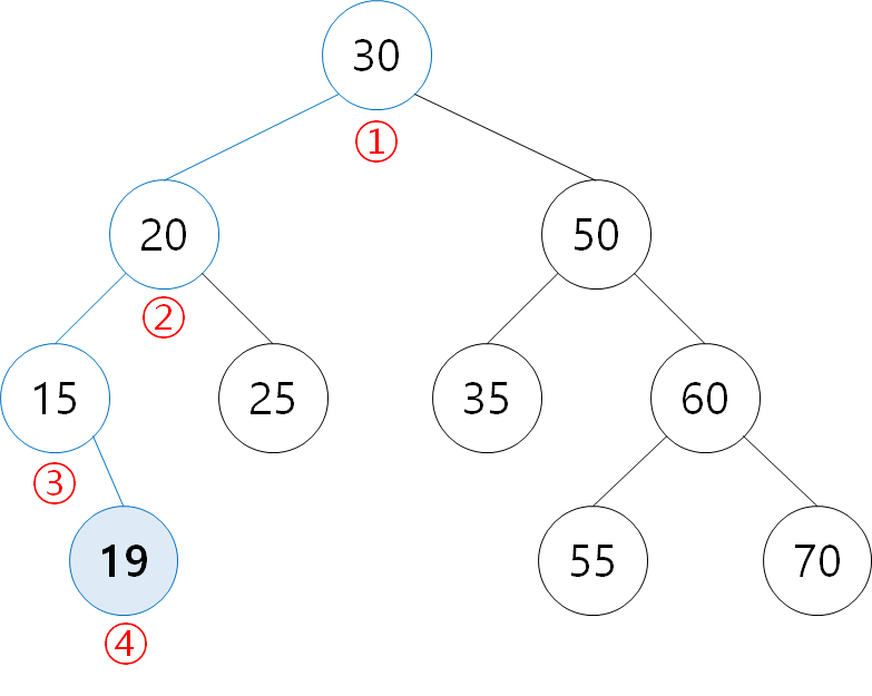① 19: 30보다 작으므로 왼쪽 탐색 ② 19: 20보다 작으로 왼쪽 탐색 ③ 19: 15보다 크므로 오른쪽 탐색 ④ 하위 노드가 없으므로 19 삽입 |