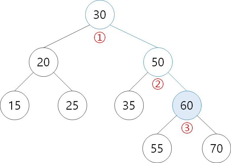 ① 60: 30보다 크므로 오른쪽 탐색 ② 60: 50보다 크으로 오른쪽 탐색 ③ 60 삭제 |