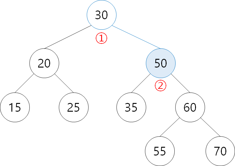 ① 50: 30보다 크므로 오른쪽 탐색 ② 50 삭제 |