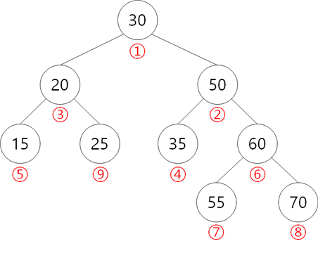 ⑧ 70: 30보다 크므로 오른쪽 탐색. 50보다 크므로 오른쪽 탐색.